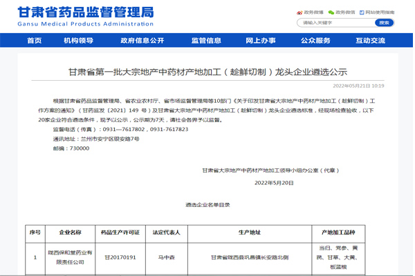2022年5月21日,甘肃省药品监督管理局在官网发布公示:根据甘肃省药品监督管理局、省农业农村厅、省市场监督管理局等10部门《关于印发甘肃省大宗地产中药材产地加工(趁鲜切制)工作方案的通知》(甘药监发〔2021〕149 号)及甘肃省大宗地产中药材产地加工(趁鲜切制)龙头企业遴选标准,经现场检查验收,认定陇西保和堂药业有限责任公司符合条件,被遴选为甘肃省第一批大宗地产中药材产地加工(趁鲜切制)龙头企业。